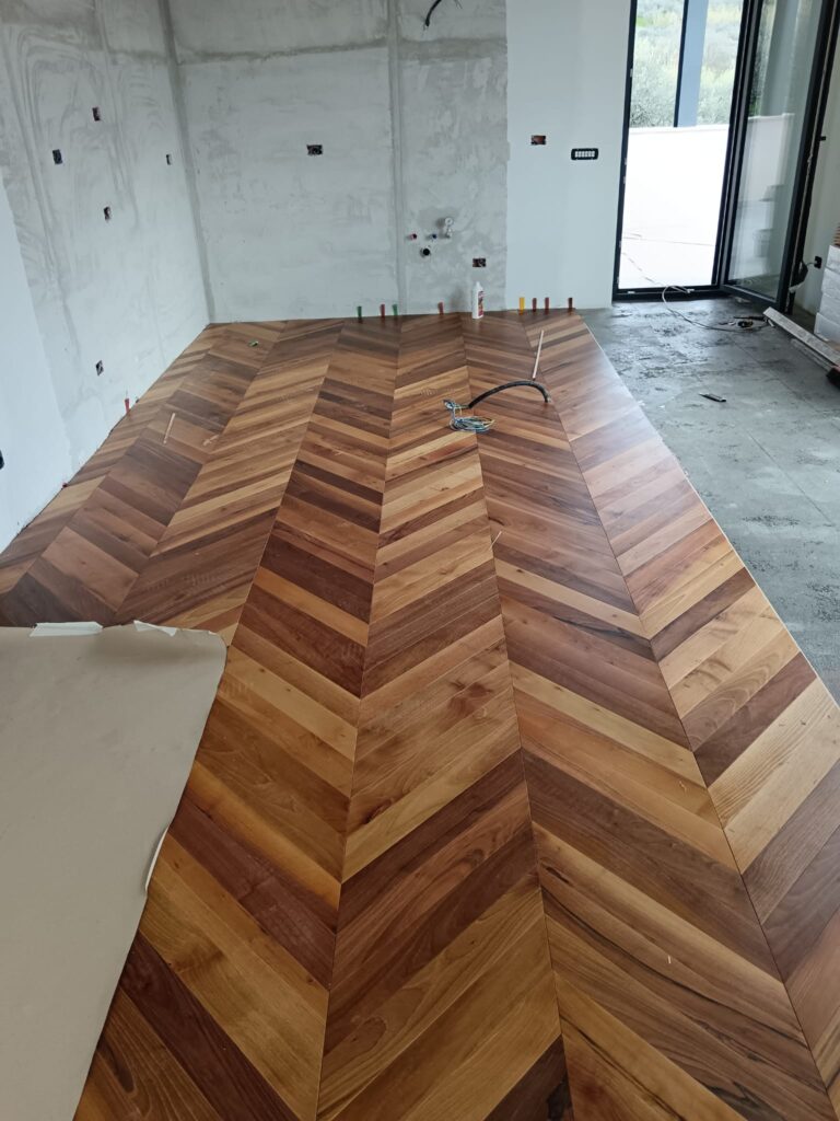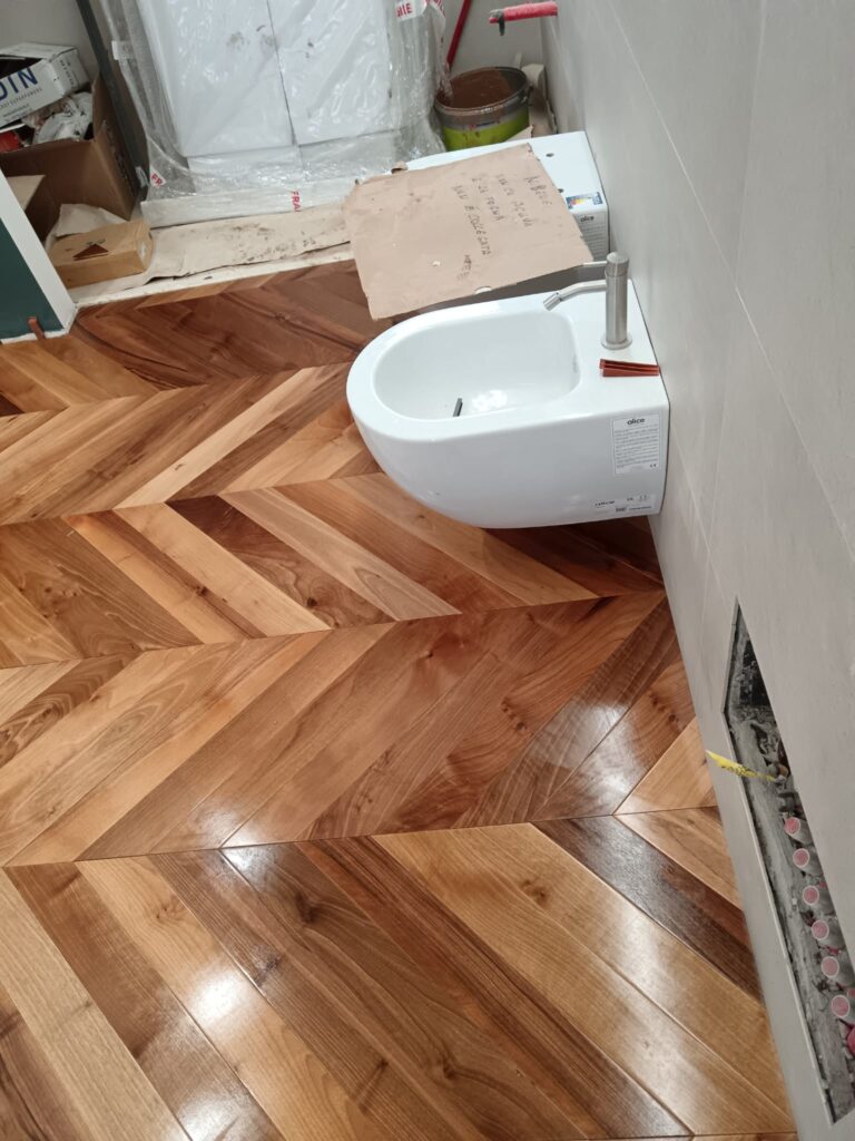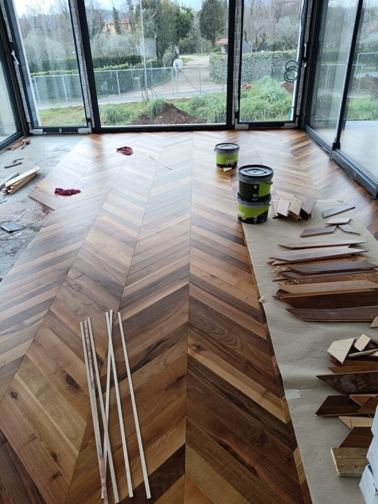 Orlandi Parquet ha realizzato la posa di un elegante parquet in legno di noce, con disegno a spina francese, valorizzando gli ambienti con raffinatezza, calore naturale e finitura di alta qualità. Un intervento artigianale che unisce stile classico e resistenza nel tempo.